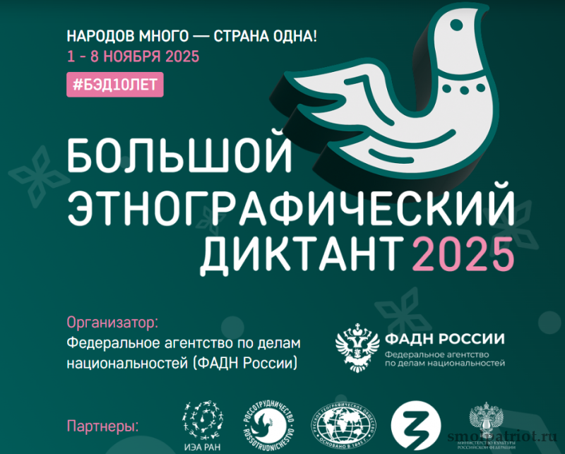 С 1 по 8 ноября 2025 года по всей России и зарубежью пройдет 10-ая Всероссийская просветительская акция «Большой этнографический диктант». Юбилейная, десятая по счету акция направлена на укрепление общероссийской гражданской идентичности, популяризацию традиционных российских духовно-нравственных ценностей и борьбу с фальсификацией истории.