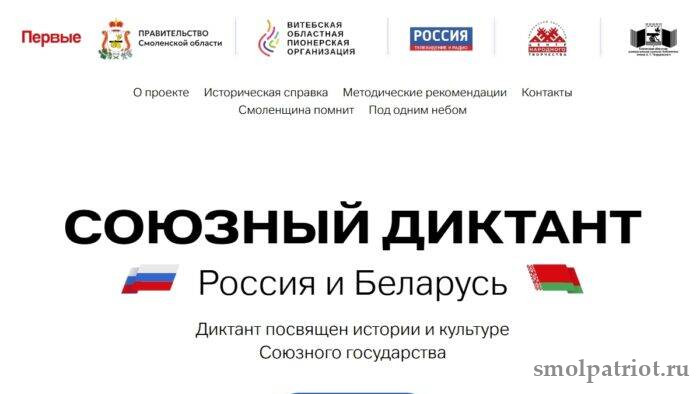 С 20 марта по 1 мая 2026 года на территории Смоленской области и Республики Беларусь проходит международная просветительская акция «Союзный диктант». Организатором выступает региональное отделение Общероссийского общественно-государственного движения детей и молодежи «Движение Первых» Смоленской области. Проект реализуется в рамках программы «Под одним небом» и направлен на укрепление знаний об истории и культуре Союзного государства.