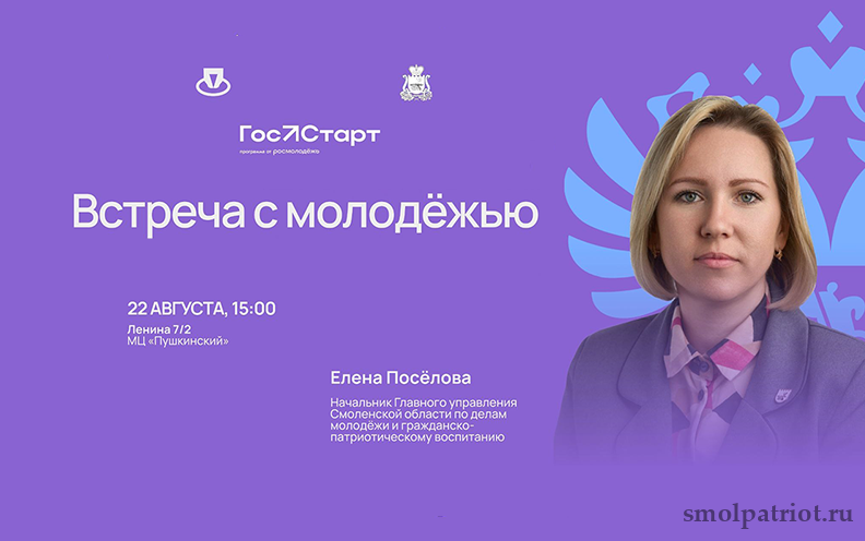 22 августа в Молодежном центре «Пушкинский» (ул. Ленина, 7/2) пройдет важное мероприятие для молодежи Смоленской области — встреча с Еленой Александровной Поселовой, начальником Главного управления по делам молодежи и гражданско-патриотическому воспитанию региона.